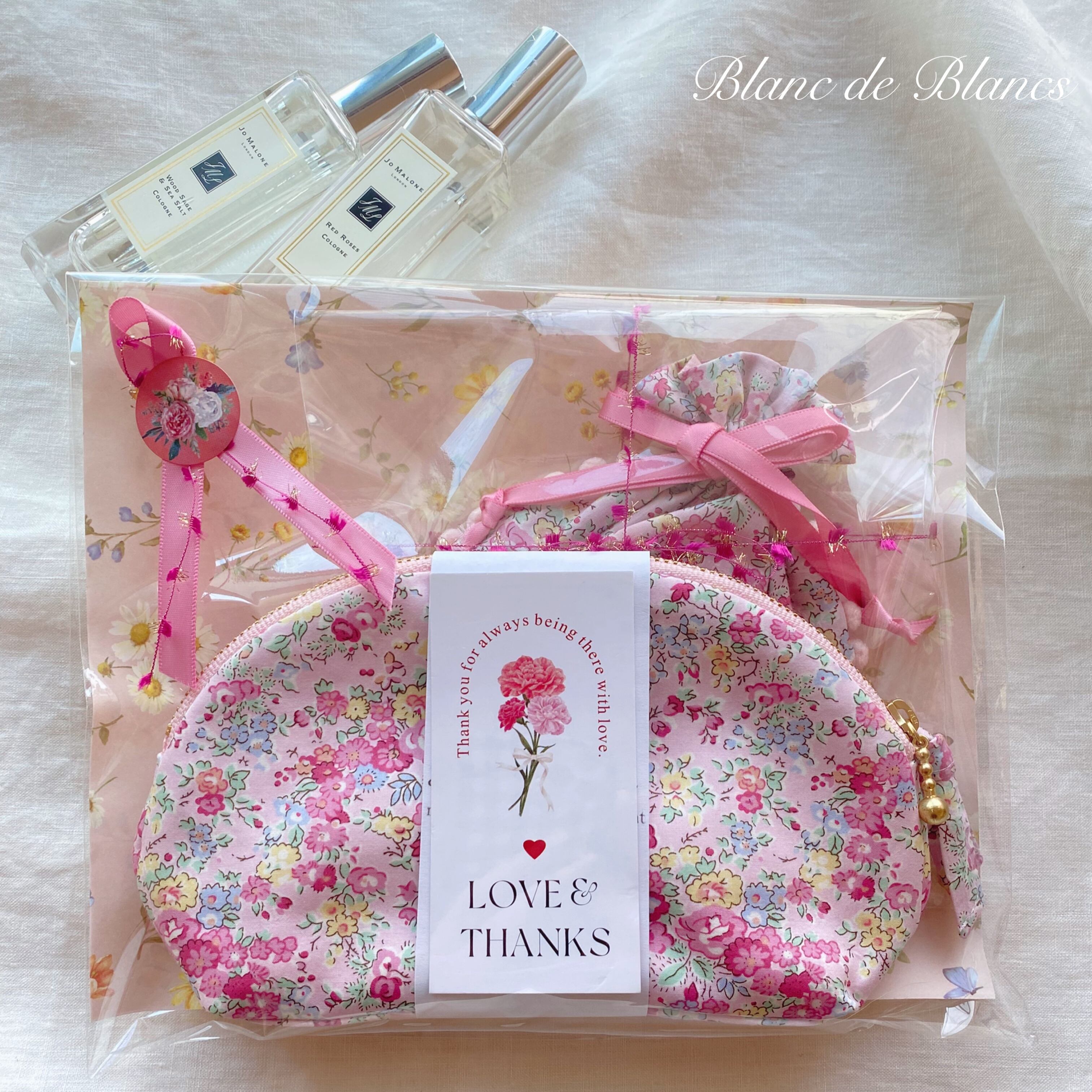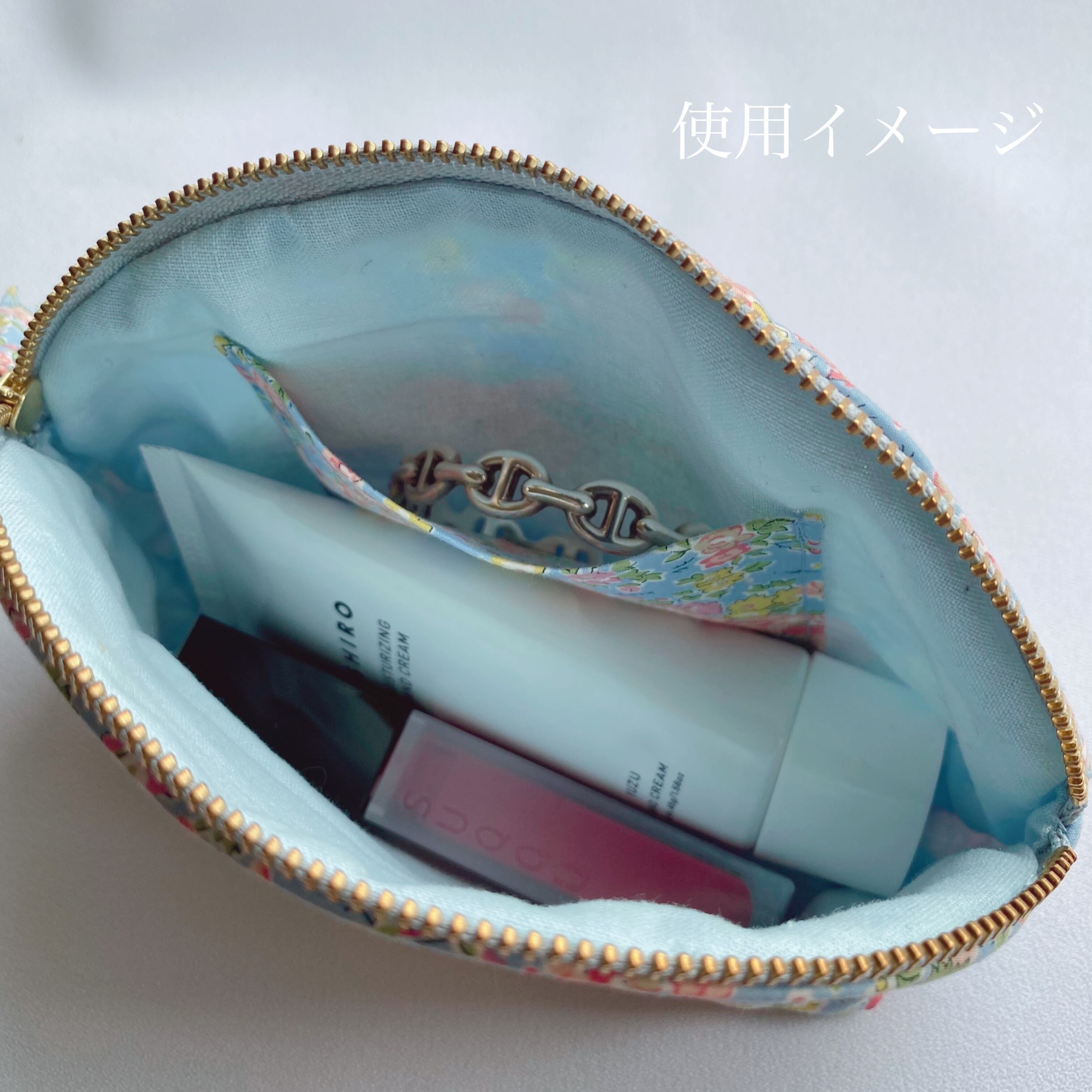 まるで小さな花束のような、リバティの巾着とシェルポーチを組み合わせたセットができました。